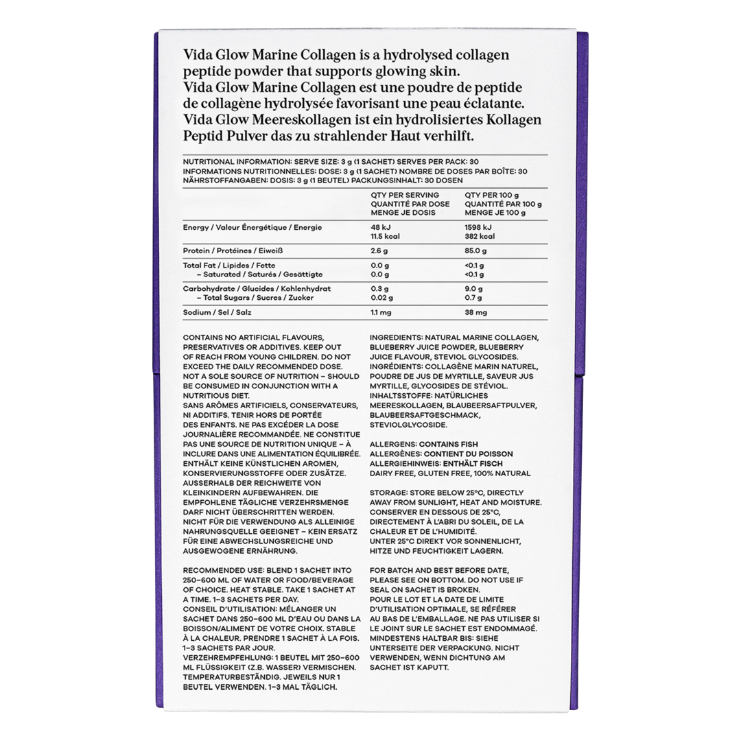Natural Marine Collagen, Blueberry Juice Powder, Blueberry Juice Flavour, Steviol Glycosides.