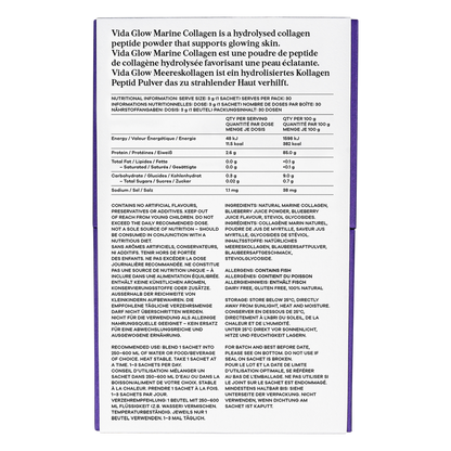 The Vida Glow Natural Marine Collagen Sachets are an easy way to target everything from acne to frail, thin hair and nails. The luxurious purple design and recyclable box make a statement on any shelf! The Marine Collagen powder is heat stable, so you can easily add it to hot and cool drinks. We like to blend the fruity flavours with juices, herbal teas, and smoothies to boost collagen.