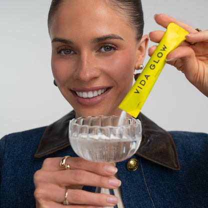 Activated using an innovative hydrolysation process, Vida Glow's marine collagen peptides are small in weight for a highly effective absorption rate of 90%. This unique process allows the sustainably-sourced collagen to enter your bloodstream, targeting your dermis (deep layer of your skin) by stimulating new collagen production. Adding Vida Glow's Daily Essentials to your daily beauty routine has been clinically proven to smooth fine lines, increase firmness and enhance the skin's elasticity.
