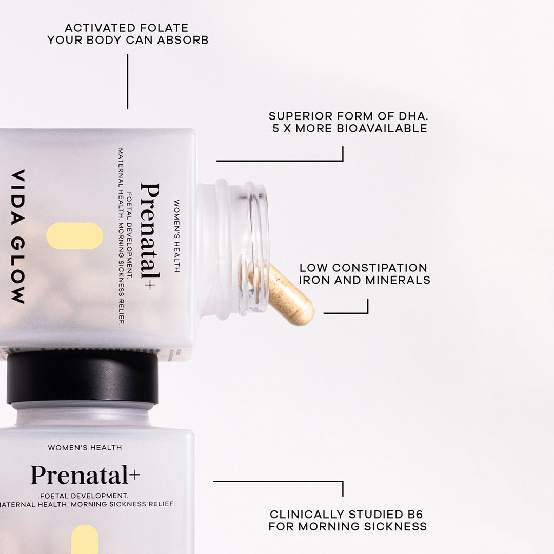 Unlike standard prenatal vitamins, Prenatal+ is a once-daily vegan capsule containing low constipation iron, and active and non-active B vitamins to cater to every mum-to-be's needs. Each ingredient is carefully selected in bioavailable forms for best absorption and utilisation by the body, without excess supplementation. Optimising nutritional intake during these times of change, Prenatal+ supports you - so you can feel good about giving your baby a healthy start.