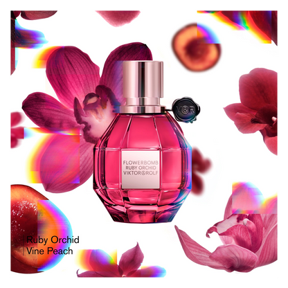 A rich and glamorous fragrance, Viktor & Rolf Flowerbomb Ruby Orchid Eau de Parfum pulses with fresh peach, luscious orchid and the comforting warmth of vanilla bean. A beguiling freshness welcomes you as a vine peach accord captures the senses with its sumptuous sweetness and joyful juiciness. The striking fragrance heart blooms with creamy ruby flower orchid, an enticing floral that isn't heavy or cloying. Finally, the fragrance base exudes a rising heat as vanilla bean adds to the sweetness of the scent while adding an unrivalled sensuality.